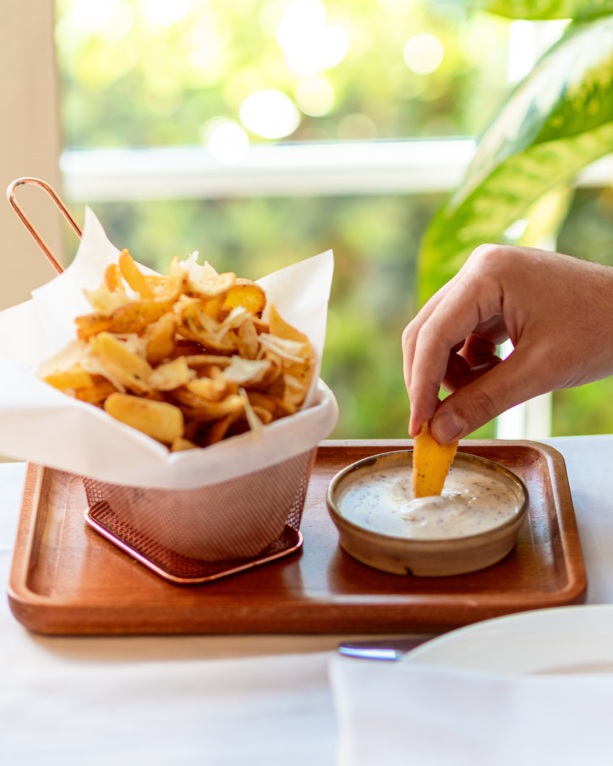 patate super të shijshme, të prera në forma të çrregullta e të skuqura me lëkurën e vet; shoqërohen
