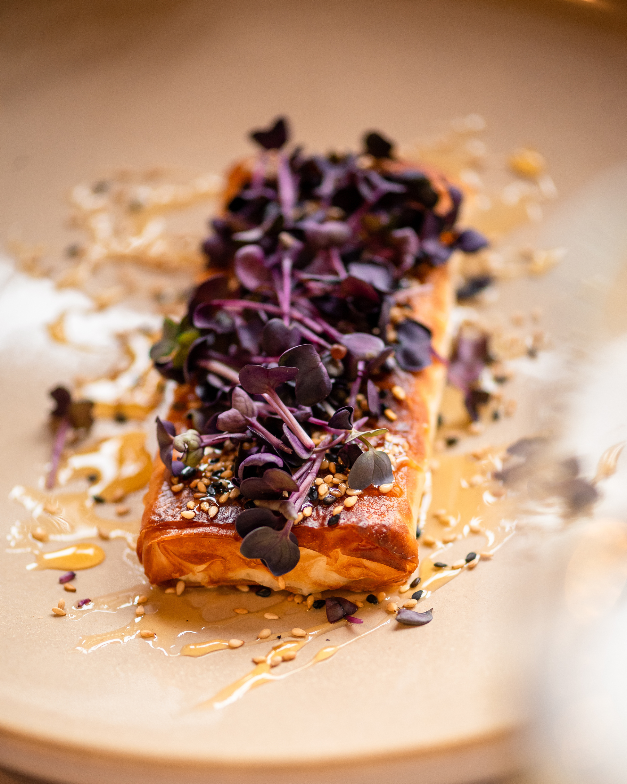 djathë i bardhë dele mbështjellë me petë të hollë, susam, mjaltë