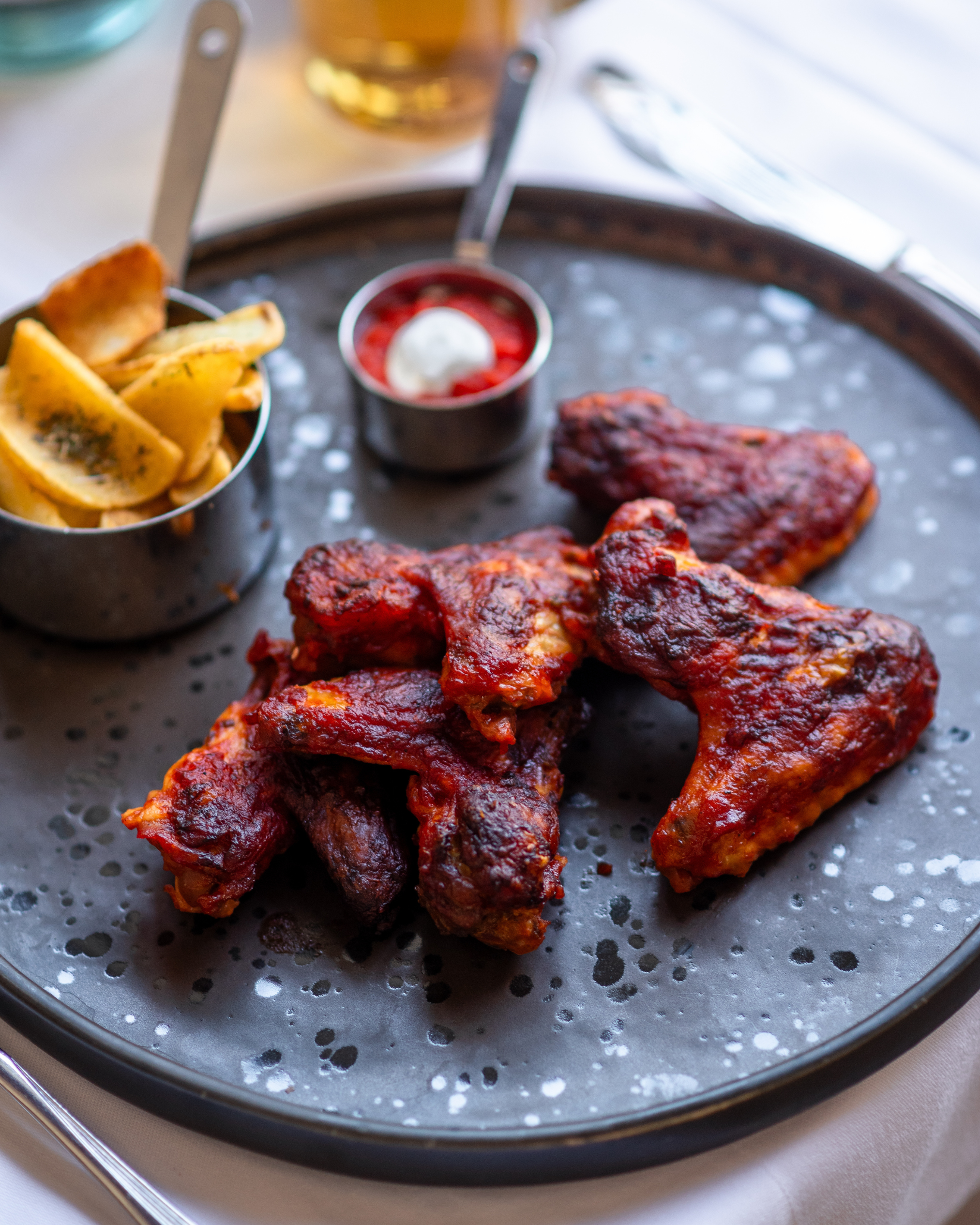 krahe pule të pjekura në furrë me salcë pikante BBQ; shoqëruar me ‘ashkla’ patatesh të skuqura dhe sipas deshirës me salcë pikante ose “sour cream”