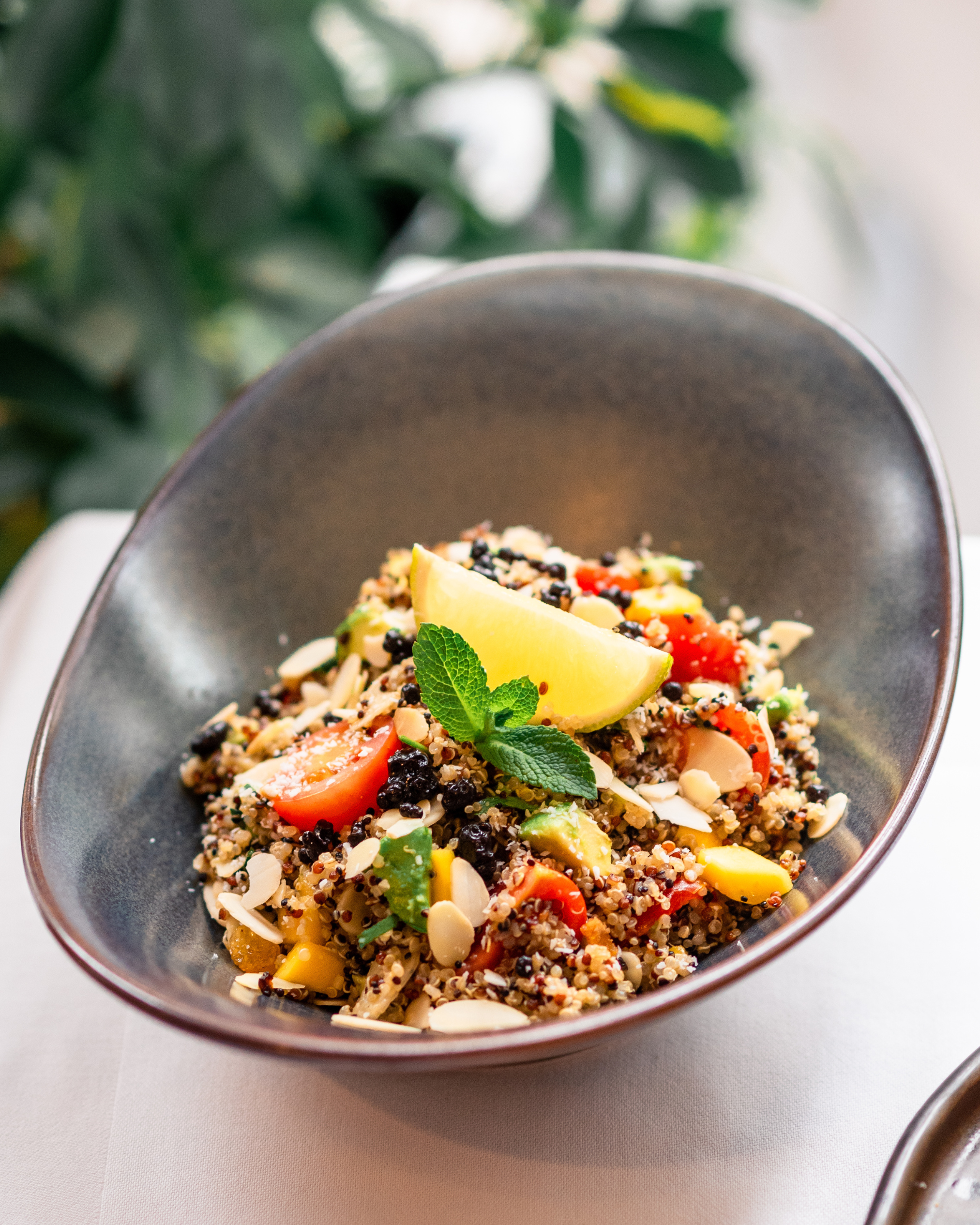 ‘quinoa’, ‘avocado’, stafidhe, rrepa të kuqe, limë, mango, arrë kokosi, bajame të pjekura, domate qershi; ‘dressing’ me vaj ulliri ekstra të virgjër, lëng lime, mustardë, açeto balsamike, mjaltë e uthull molle organike