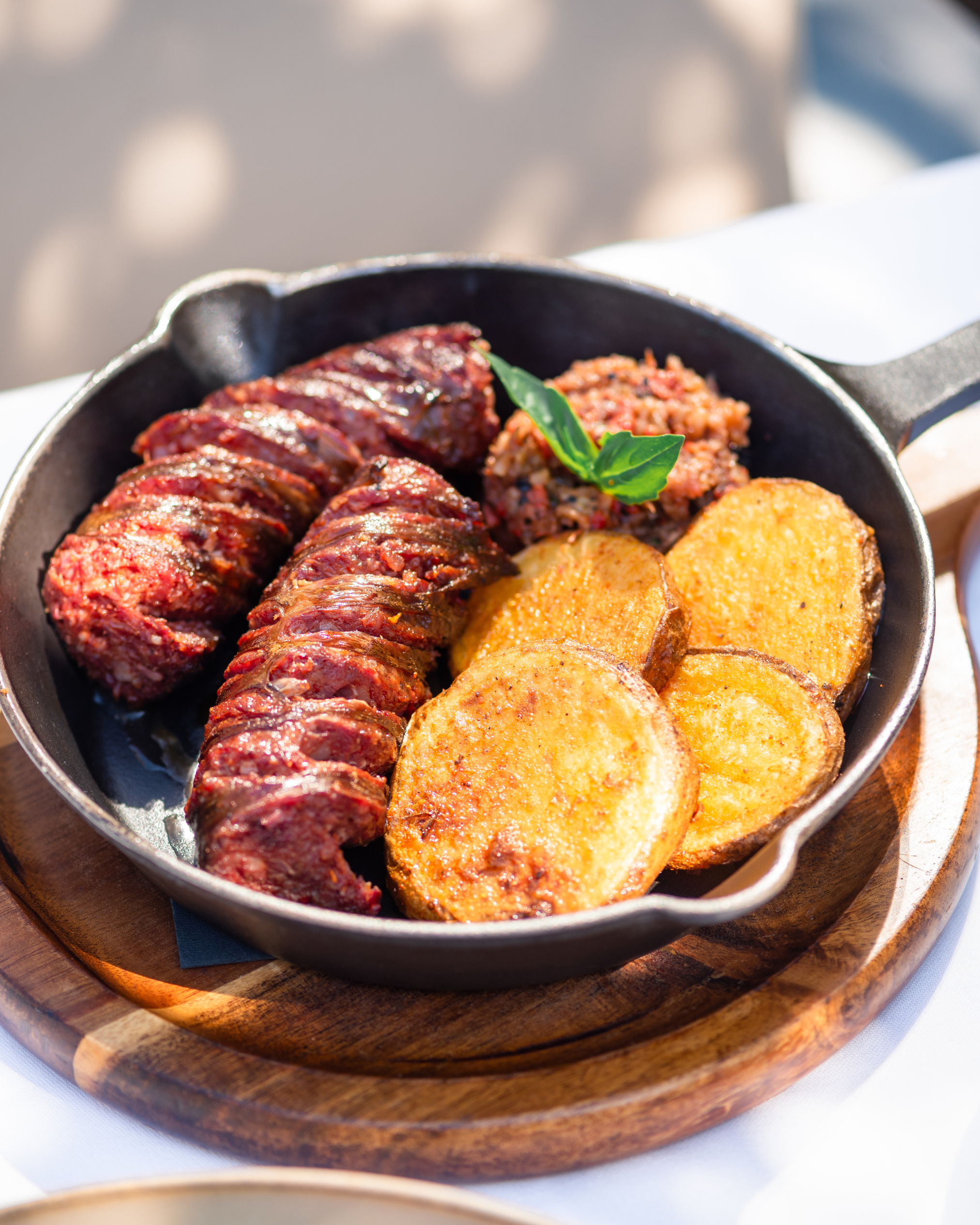 Suxhuk Kosove i pjekur në zgarë; shoqërohet me perime të pjekura/tymosura prerë në copëza të vogla, marinuar me sumak, trumzë dhe vaj ulliri ekstra të virgjër & patate krokante me lëkurë